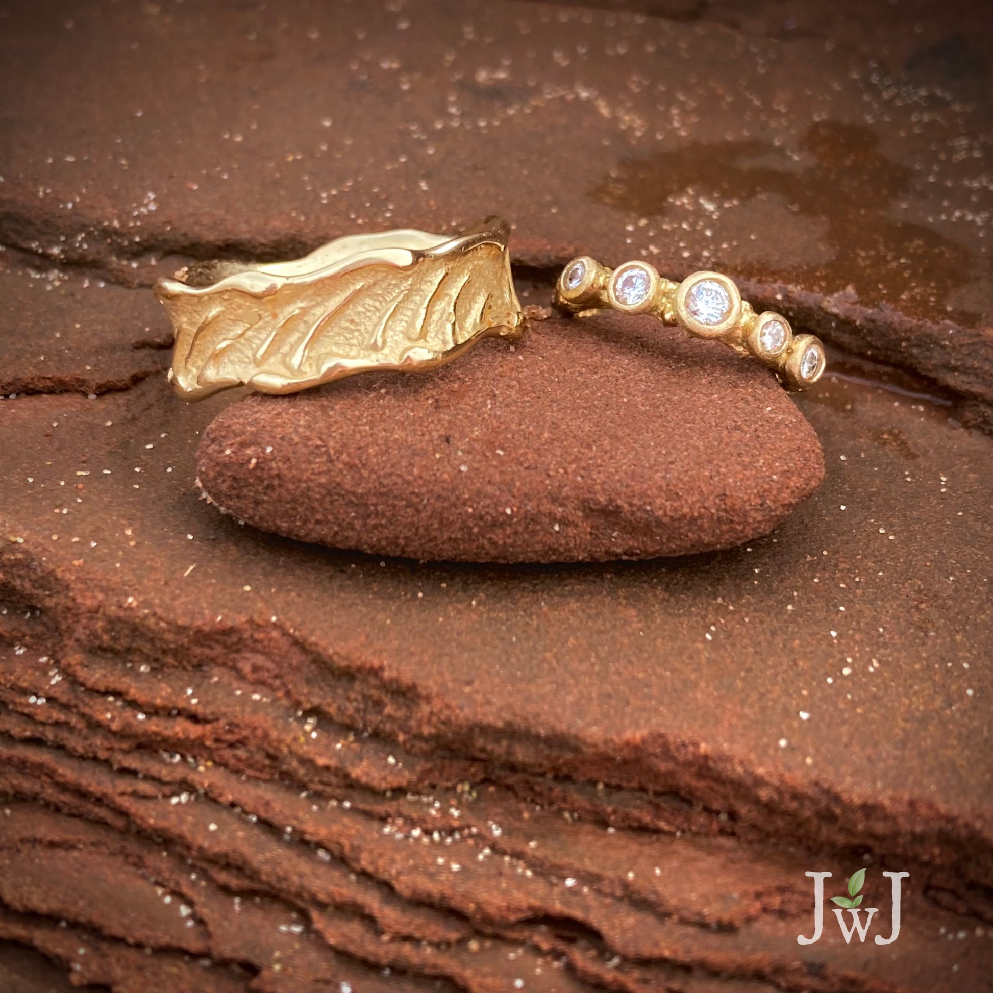 18kt yellow gold, or platinum. - Sand textured background with wavy polished raised edges.